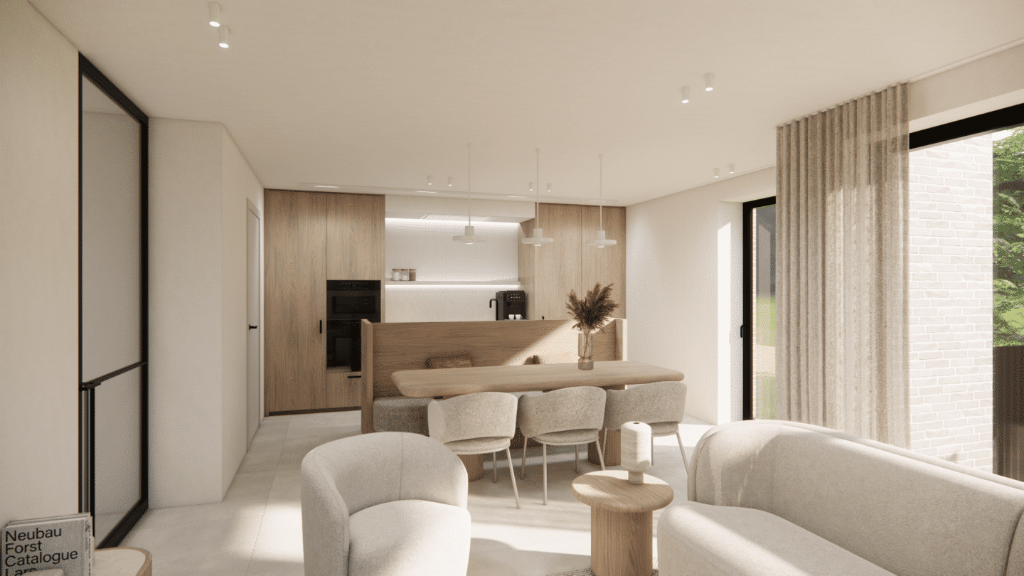 De architectuur is tijdloos en verfijnd, met lichte baksteen, houten gevelaccenten, zwarte aluminium buitenschrijnwerken en grote raampartijen die het parkgevoel maximaal naar binnen brengen.