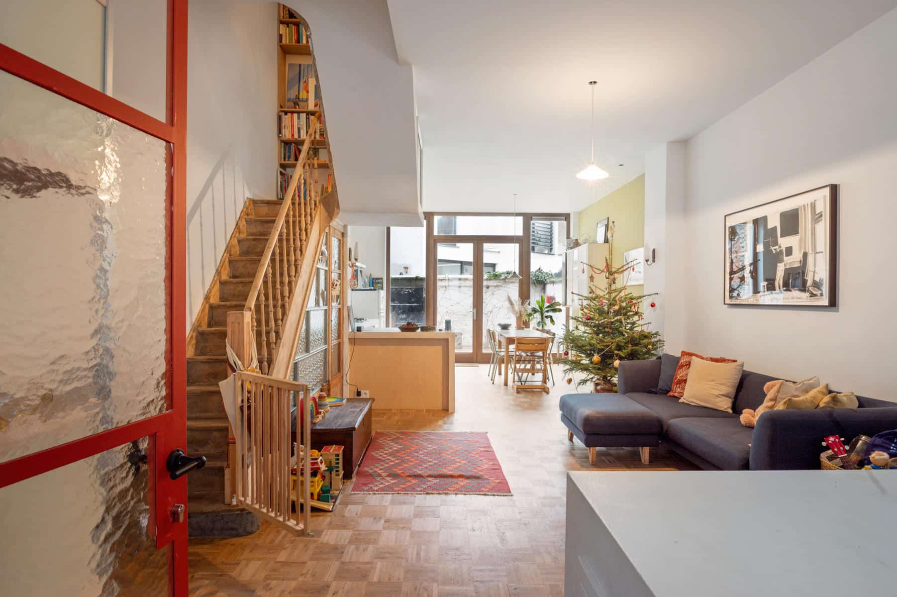 De lieflijke gevel heet u alvast welkom. Kom binnen in de inkomhal, welke op een creatieve manier gescheiden wordt van de leefruimte via een constructie van staal en glas. En het staal is absoluut niet kil, het heeft een supermooie, warme rode kleur. Deze originele scheiding houdt de warmte binnen en de ramen zorgen er op hun beurt voor dat het ruimtelijk gevoel behouden wordt. WIN WIN!