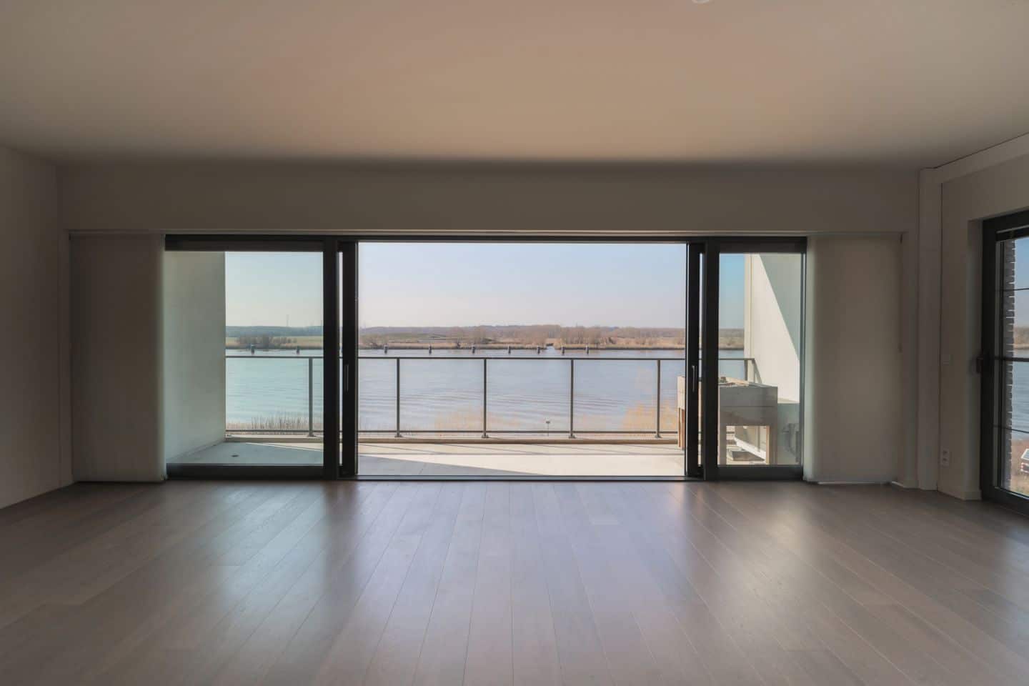 De lichtrijke leefruimte vormt het hart van het appartement. Het grote schuifraam zorgt voor een maximale lichtinval en geeft uit op het westgericht terras, waar u in alle privacy geniet van de avondzon en het indrukwekkende Scheldezicht.