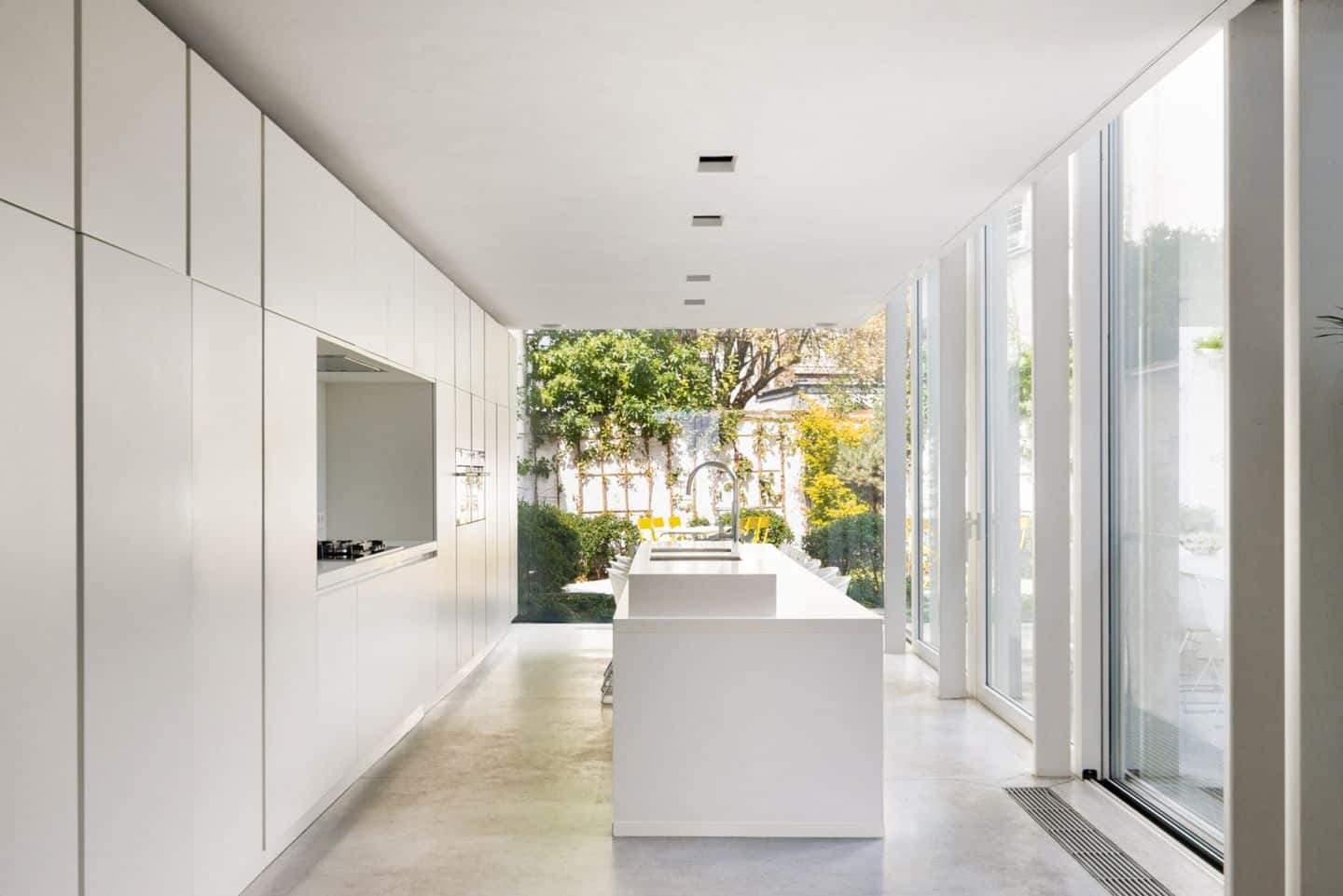 De eetkamer brengt je vlot naar de moderne leefkeuken op polybetonvloer. Denk: strak, volledig geïnstalleerd, met vloerverwarming en badend in het licht dankzij grote raampartijen. Hier kook je niet, hier perform je.