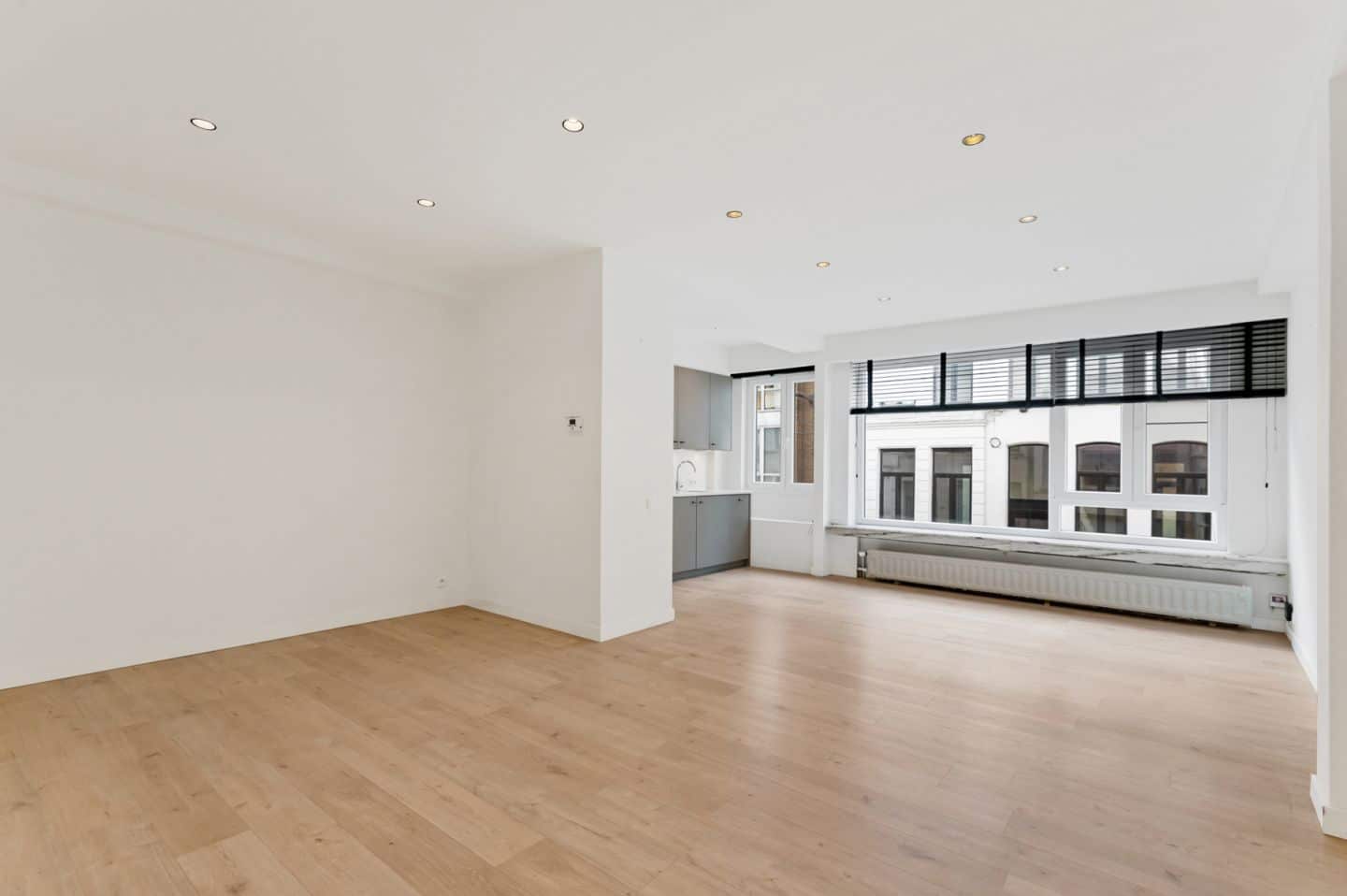 Het appartement beschikt over een ruime woonkamer met grote ramen die veel daglicht binnenlaten.