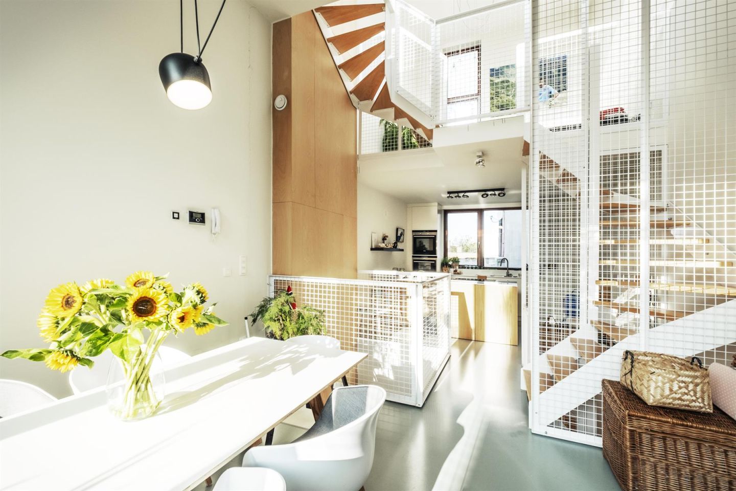 Bij het betreden van de woning heb je een ruime inkomhal, een berging en een functionele ruimte momenteel ingericht als bureau. Aan de bureauruimte bevindt zich de stadstuin. Op de 1e verdieping bevinden zich twee mooi ingerichte en afgewerkte slaapkamers met dressing en de badkamer. Het leefgedeelte bevindt zich op de 2e en 3e verdieping. De architect heeft hiervoor bewust gekozen, het leefgedeelte sluit namelijk aan op een prachtig zonneterras. Op de 2e verdieping een mooi ingerichte keuken, met aansluitend de eetkamer. Hier is een vide gecreëerd waardoor er rechtstreeks contact is met het gezellige salon dat uitgeeft op het dakterras. Er is ook een kelder en een autostaanplaats. Aankoopprijs autostaanplaats = extra 25000EUR