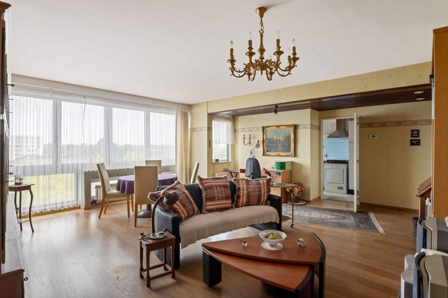 Het appartement ligt hoog en is bereikbaar met een lift, wat zorgt voor een zee aan licht en een extra ruim gevoel in de leefruimte. De keuken is nog wat klassiek, maar met een opfrisbeurt kan je er ook een open, moderne leefruimte van maken.