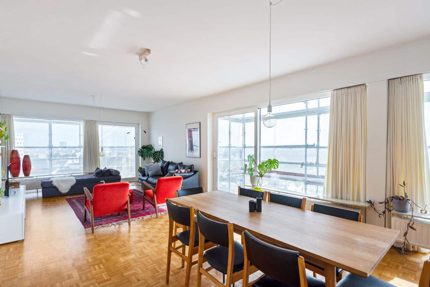 De leefruimte op warme blokparket is royaal, uitnodigend en badend in het licht. Dankzij de hoogte heb je een spectaculair zicht en van pottenkijkers heb je geen last!