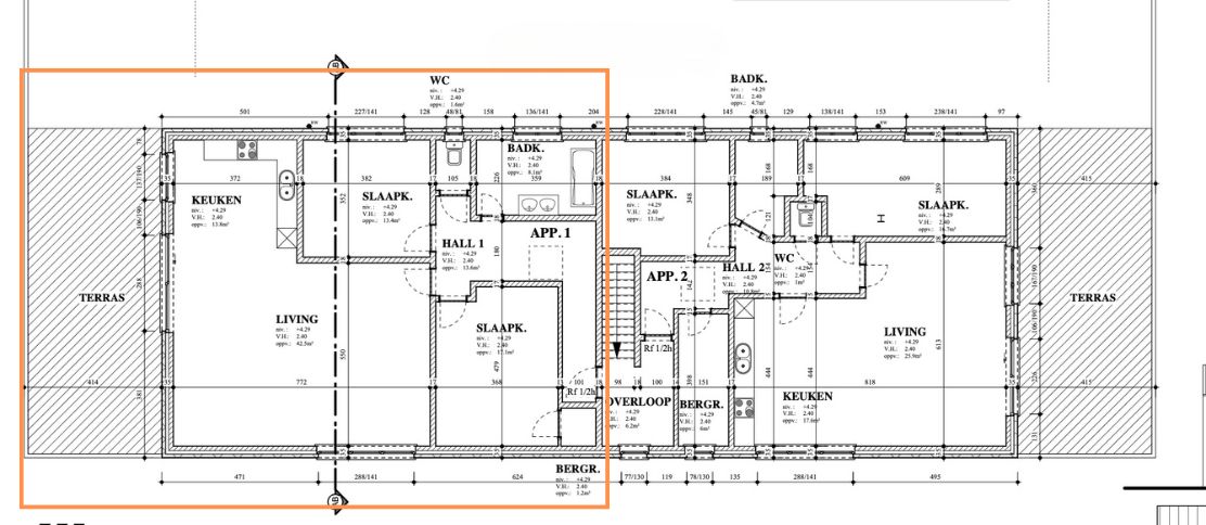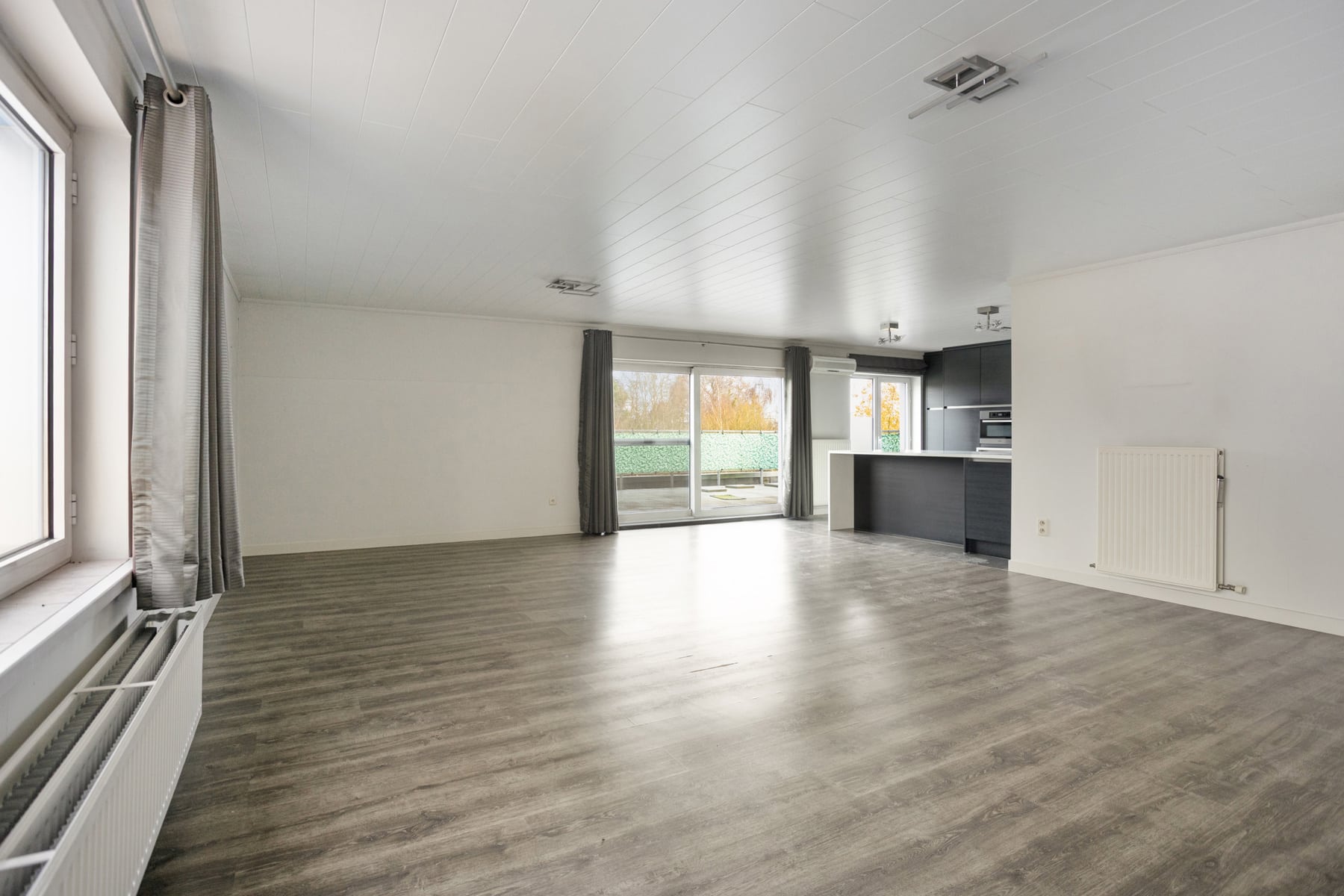 De open leefruimte vormt het hart van het appartement en sluit naadloos aan op de recent vernieuwde keuken. Grote troef? De directe toegang tot het indrukwekkende terras van 40 m², waar je elke dag kan genieten van een prachtig, open uitzicht over de achterliggende velden.