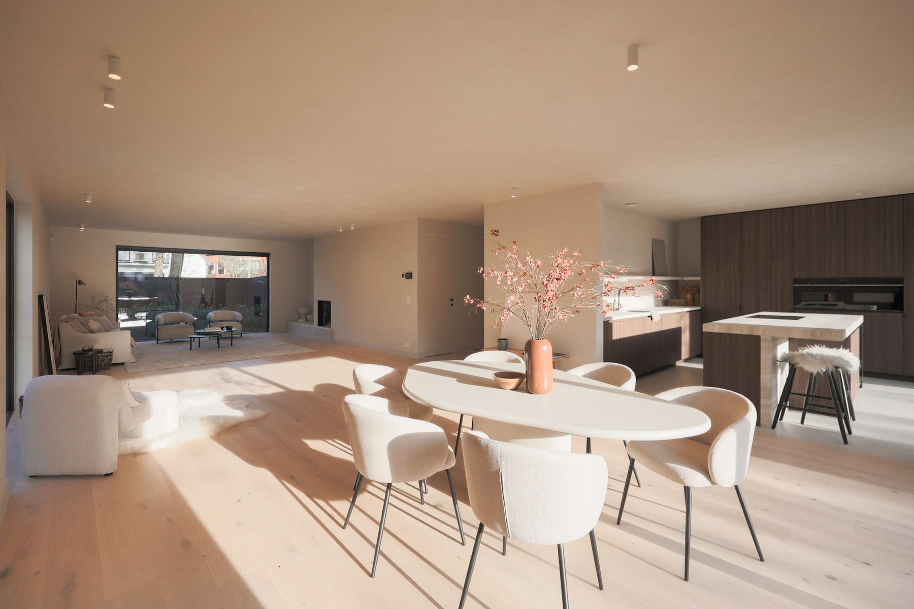 De leefruimte strekt zich breed en licht uit, met aan de voorzijde een warme zithoek rond de gashaard. Perfect voor winteravonden, lange gesprekken of gewoon even niets doen (ook belangrijk). Achteraan speelt het echte leven zich af: een indrukwekkende open keuken waar design en functionaliteit hand in hand gaan.