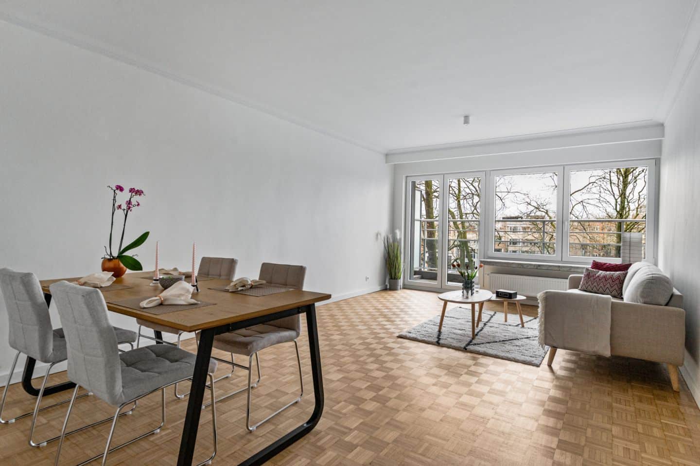 Bij het binnenkomen valt meteen de frisse, hedendaagse afwerking op. De leefruimte geniet van veel natuurlijk licht en vormt samen met de moderne keuken een aangename plek om thuis te komen, te ontspannen of gasten te ontvangen. Alles werd met oog voor detail vernieuwd, waardoor je hier geniet van hedendaags wooncomfort zonder renovatiestress. Kijk maar naar de prachtige gerenoveerde vloer!